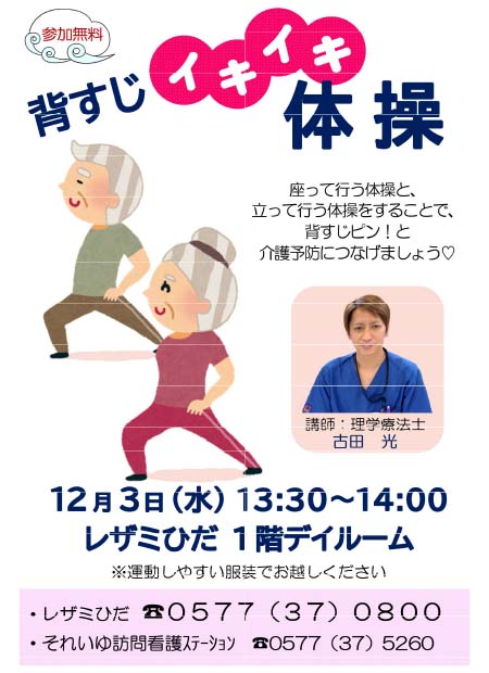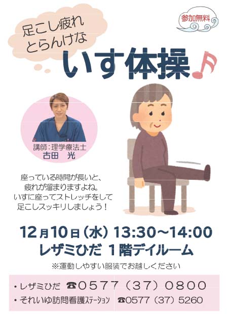 12月3日(水)・10日(水)のいずれも13時半から30分間、「イキイキ健康体操」を実施します。寒くなるとどうしてもカラダを動かすことが少なくなります。理学療法士による体操の指導で、気持ちもスッキリさせましょう。 皆様のご参加をお待ちします!!